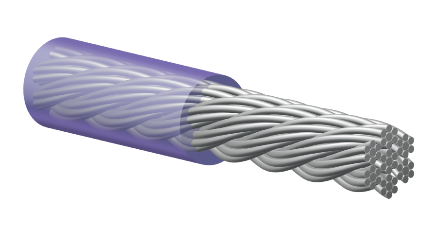 七本撚りのワイヤーをさらに七本組み合わせたものにナイロンコーティングをした商品となります。
